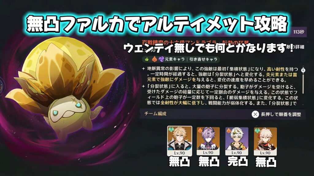 【原神】ポイントは万葉爆発!無凸ファルカ(ウェンティ無し)でアルティメットマンドラゴラ攻略 幽境の激戦 Luna Ⅴ gamemen 1週間前 万葉爆発のおかげで大分安定して集敵出来ました! たまにぶっ飛びますが… ご視聴ありがとうございます! 少しでも参考になると思ったらチャンネル登録、高評価、よろしくお願いします✨ 00:00 マンドラゴラ戦 02:05 ステータス X⬇️良かったらフォローして下さい🙇♂️ ? BGM⬇️